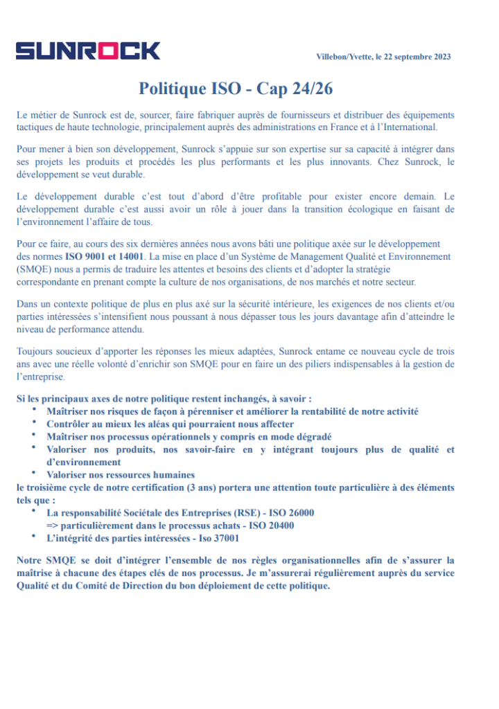 Le métier de SUNROCK est de sourcer, faire fabriquer auprès de fournisseurs et distribuer des équipements tactiques de haute technologie, principalement auprès des administrations en France et à l’international.